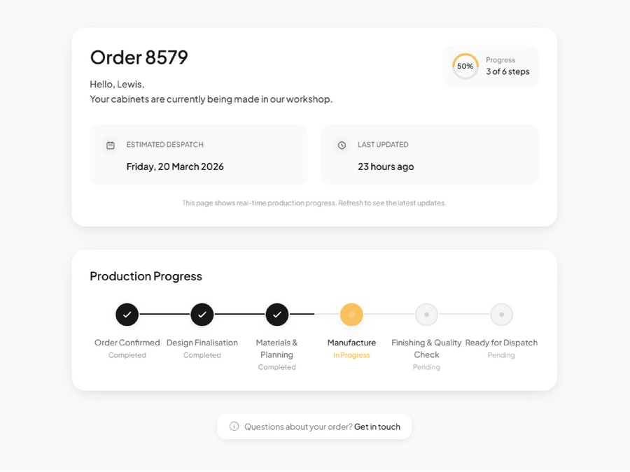 Once your design is approved, your cabinetry enters production. You’ll be able to track progress throughout.