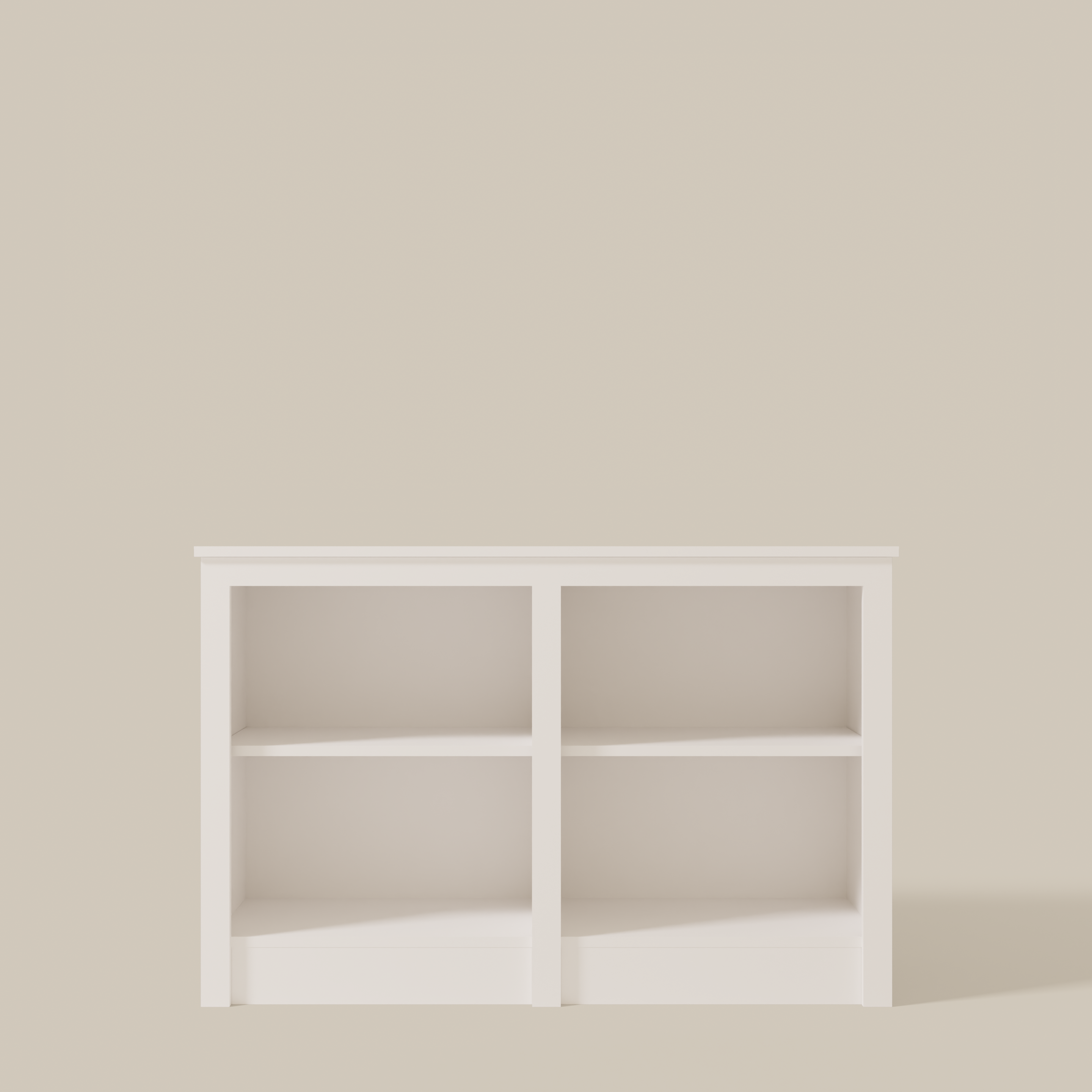 Its two-column bookshelf configuration provides practical storage while maintaining strong horizontal proportions. The lower height makes it particularly suited to built-in alcove bookcase installations where a fitted appearance is desired without full-height cabinetry.
