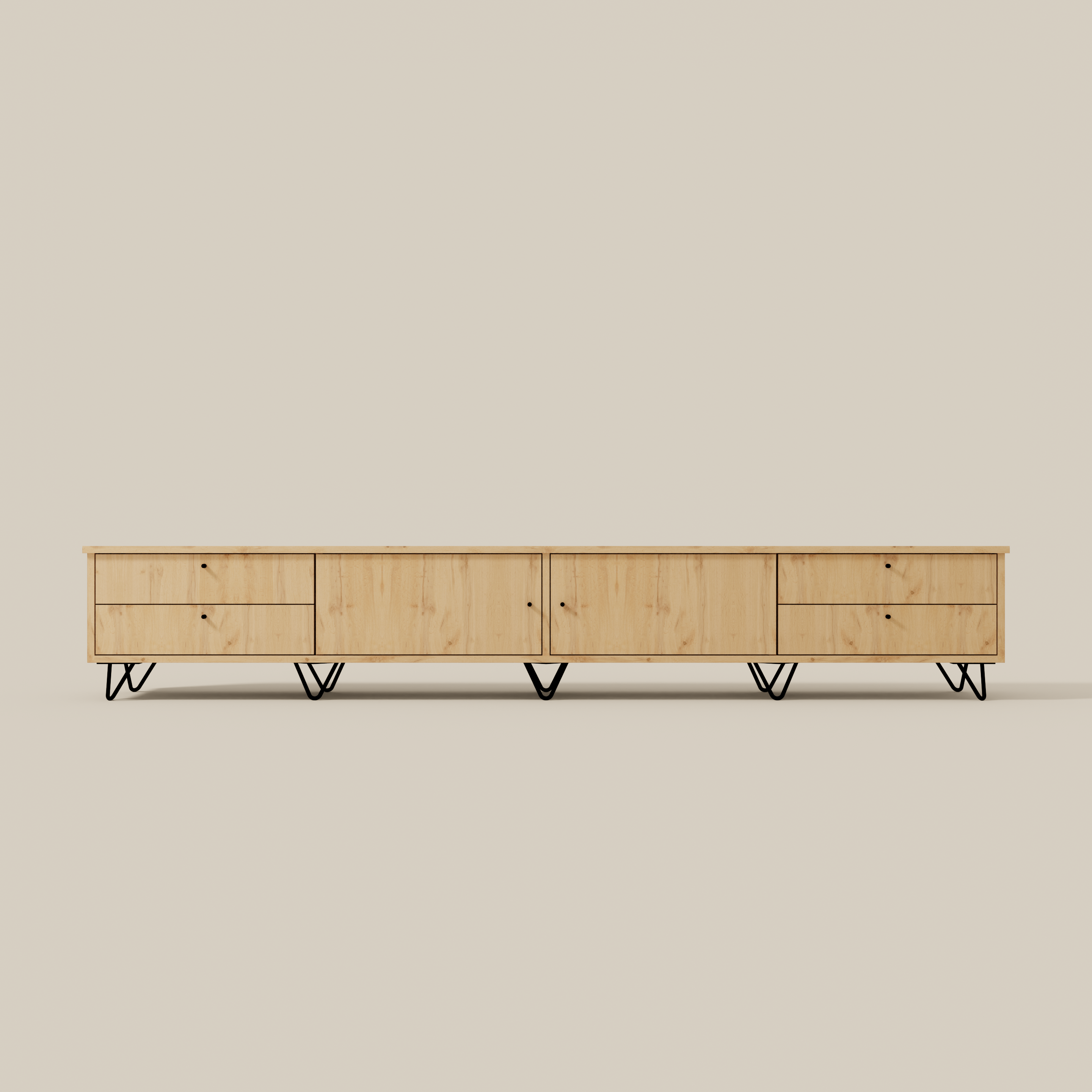 Two wide cupboards provide generous hidden storage, while the drawers keep smaller items organised and easy to reach. Raised on elegant hairpin legs, the cabinet feels light and modern while maintaining a solid, functional structure.