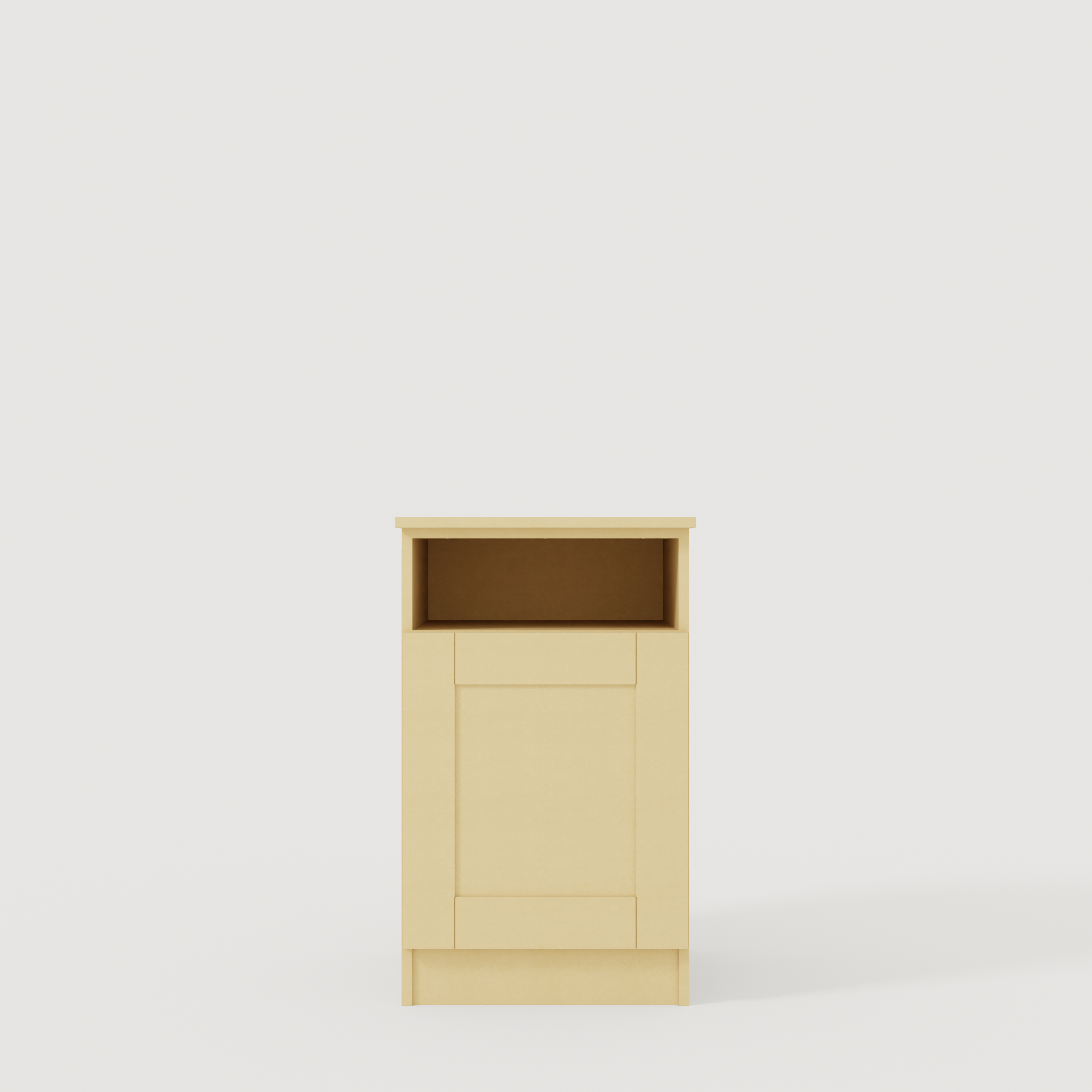 The Low Single Cupboard with Open Shelf combines compact concealed storage with practical display space. Fully customisable in height, width and depth, it can be configured precisely to suit smaller wall sections or integrated storage layouts.